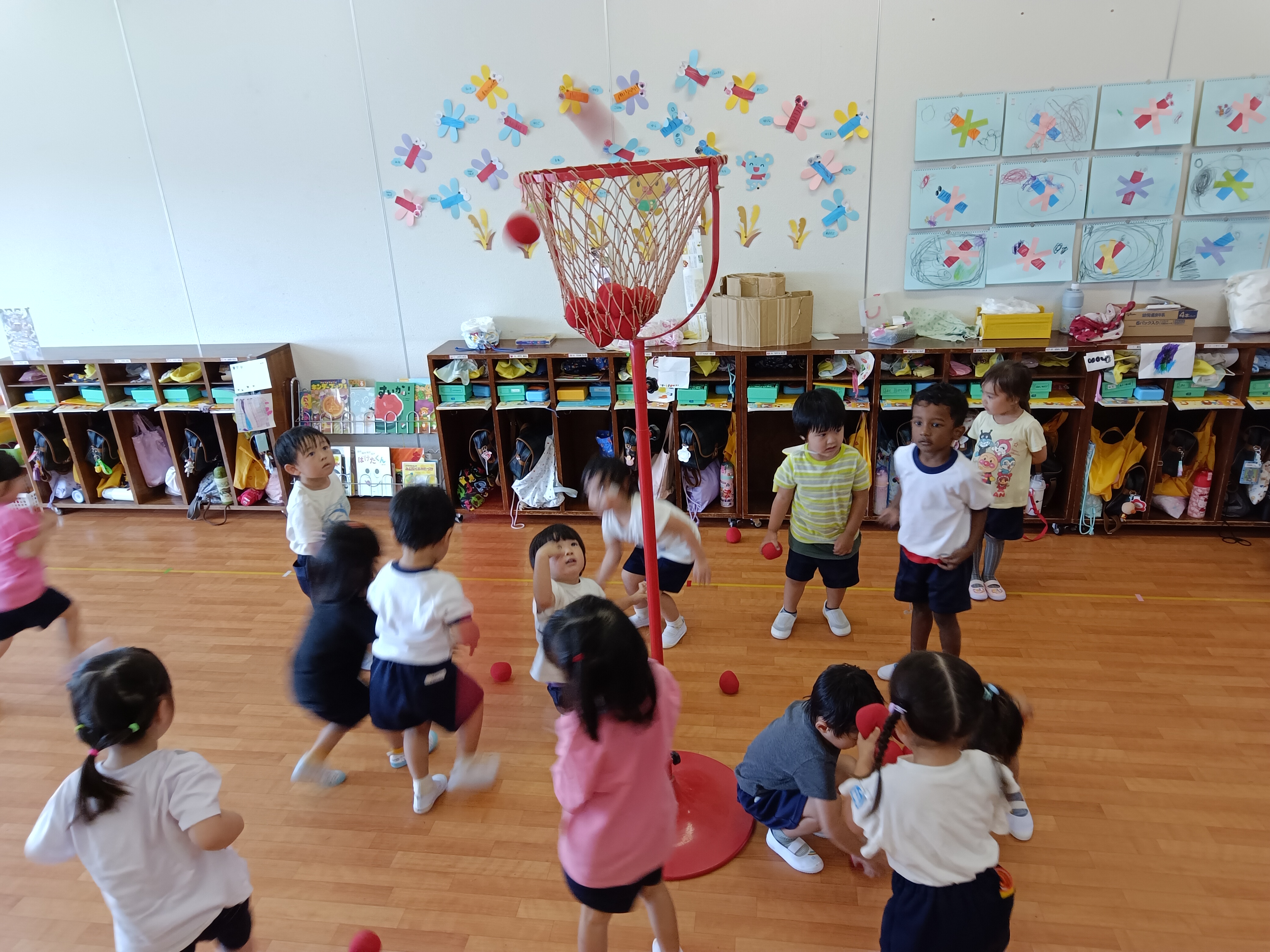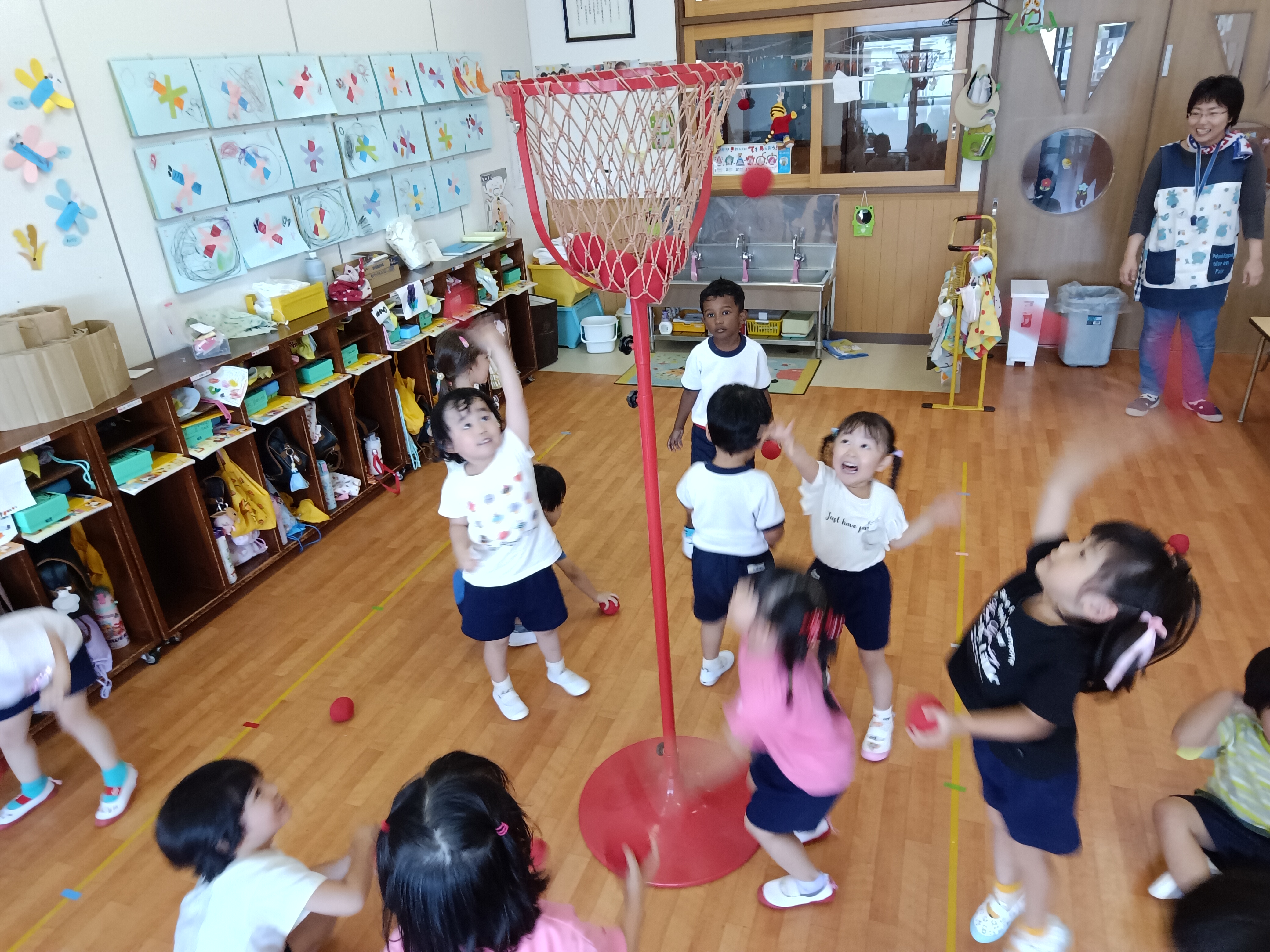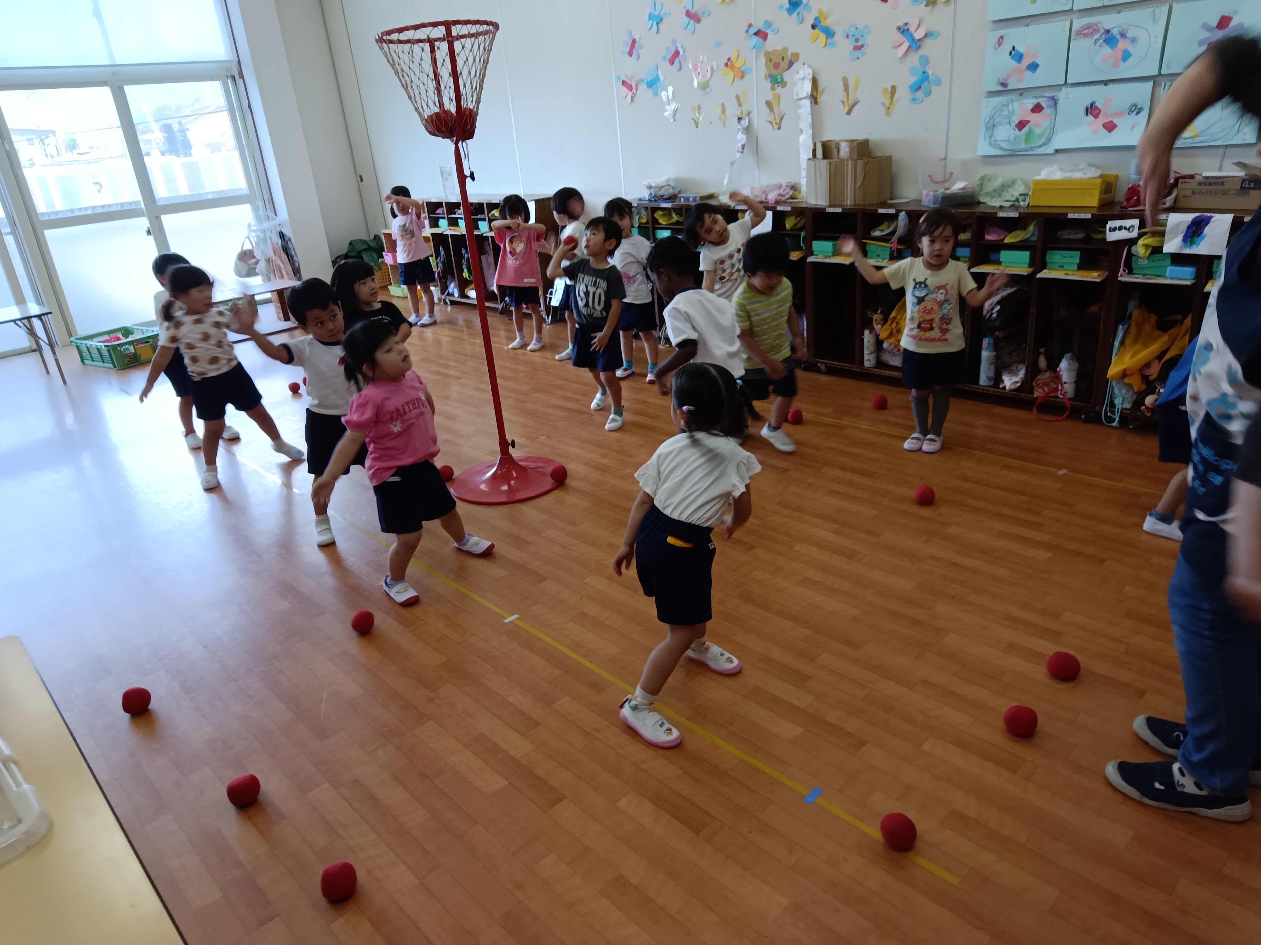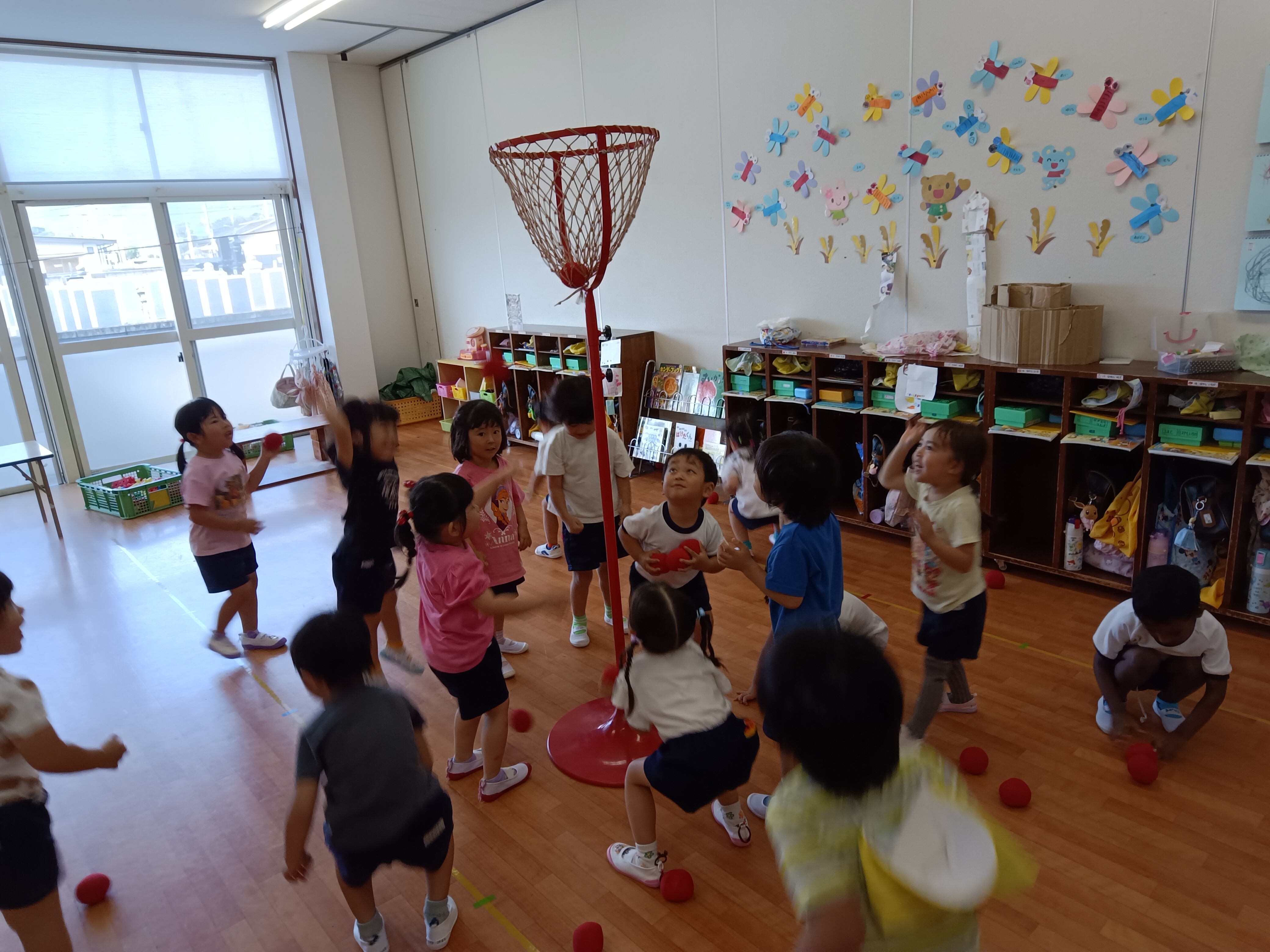 曲が止まると…「それーっ」と一斉にたまをかごの中にめがけて投げたよ!
