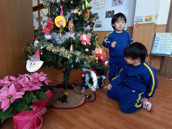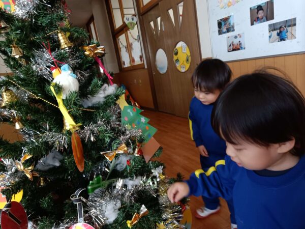 幼稚園のクリスマスツリーが大好きな子どもたちは「うわ~!」「キラキラだね!」「ベルがあるよ!」と
