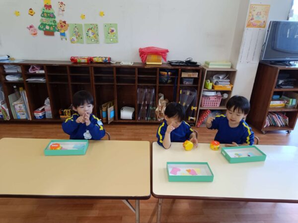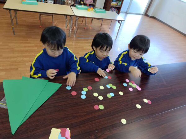 3つの飾りをそれぞれ「いーち、にー、さーん」と数えながら好きな色選んだよ♪