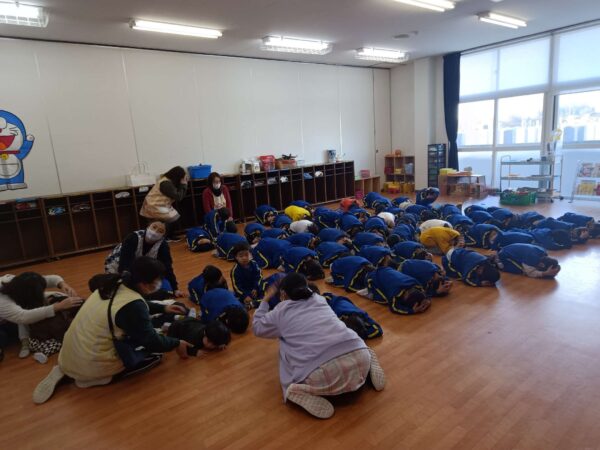 もしもの時に備えて告知なしの避難訓練を行いました。突然でしたが、しっかり丸くなって頭を守り、慌てずに外に逃げる事もできました。