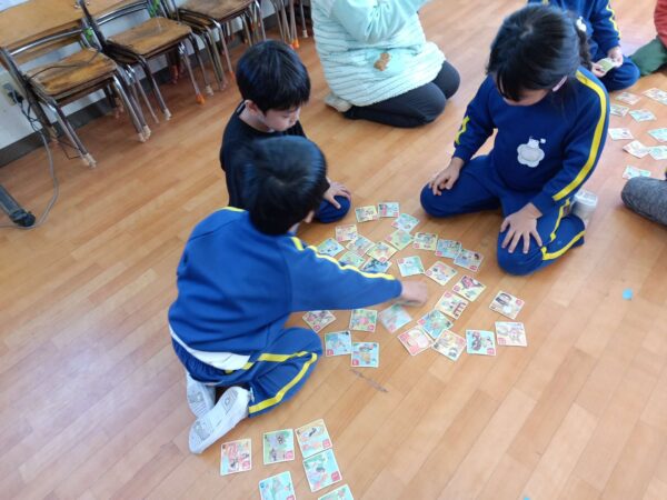 カルタ取りを初めてやったよという子もいれば、いつもやっているよという子も。