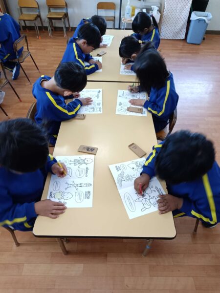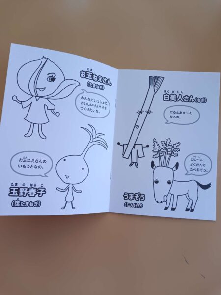 ぬりえの野菜や食べ物のキャラクターには名前があり、1つずつ紹介すると、「面白い名前だね!」「可愛い」と笑いながら食べ物への興味を示していました☺️